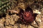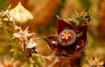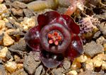 Succulent perennial. Stems branched, more or less erect, 6-angled, tubercles with a fleshy spine-like tip. Flowers in clusters of 3-4 on the young stems, up to 3.8 cm in diameter, maroon often streaked. Corolla lobes smooth and shiny in the basal half, with club-shaped hairs between the lobes. |