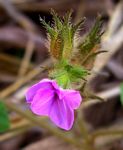Annual herb, twining or occasionally prostrate. Stems up to 2.5m long, densely covered with white to yellowish bristly hairs. Leaves broadly ovate-cordate in outline, up to 18.5 × 17.5 cm, deeply 3-lobed, rarely entire, bristly hairy above, densely white-woolly below; petiole 4-10 cm long. Inflorescences axillary, several-flowered on a peduncle up to 7 cm long. Calyx densely bristly hairy, Corolla relatively small (c. 2 cm), funnel-shaped, pink or mauve with a darker centre. Capsule ovoid, softly hairy above. |
