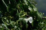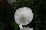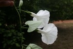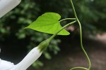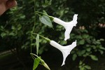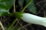 Robust climber or liane with stems up to 6m long. Leaves ovate or triangular, up to 13.5 cm long, cordate at the base with a broad or narrow sinus, dark glossy green; margin entire; petiole slender, up to 8 cm long. Flowers in lax few to many-flowered axillary inflorescences, rarely solitary; peduncle 2-11 cm long; pedicels and secondary peduncles up to 3 cm long. Sepals ovate-elliptic, 1.3-1.7 cm long. Corolla pure white, lilac or pinkish with a darker centre, with a more or less cylindrical tube 5-8 cm long. Capsule globose, leathery, hairless, tipped by the persistent style. |