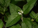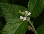 Perennial herb or small shrub, up to c. 1.5m tall. Stems woody at the base, somewhat 4-angled; branchlets with long, tubercle-based whitish hairs, spreading bristles and scattered sessile glands. Leaves mostly opposite, rarely 3-whorled, petiolate, more or less broadly ovate, 3-9 cm long, light green, somewhat bristly with tubercule-based hairs and impressed venation above, paler and more densely softly hairy with raised venation below; margin with 16-28 teeth. Inflorescences in axillary ovoid spikes, up to 15 cm long, with leaf-like overlapping bracts. Flowers lilac, mauve, pink or purple with a yellowish throat; corolla tube 5-6 mm long. Fruit a drupe, c. 3.5 × 3 mm, lilac to dark purple hen ripe. |