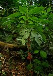 Soft-wooded shrub, up to 3.5 m. Leaves opposite, ovate to elliptic, 8-20 cm long, thinly textured, hairy or velvety, particularly below, apex narrowing into a drip tip; margin shallowly serrate. Flowers in short axillary racemes, usually on the nodes below the new leaves, up to 2 cm long, bright deep, hairy. Fruit consisting of 4 nutlets, hidden by the persistent calyx. |