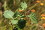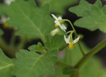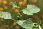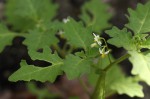 Erect or spreading annual herb, 20-100 cm high.Branches more or less angular or narrowly winged wit spaced soft teeth or prickle-like hairs. Leaves elliptic to ovate, up to 11 cm long, more or less deeply lobed, decurrent into a winged petiole, pubescent on both surfaces. Flowers in 3-7-flowered umbelliform inflorescences, white to creamy-yellow, often with a purplish stripe down the centre of the lobes. Fruit on recurved or strongly reflexed pedicels, more or less depressed globose, 6-8 mm in diameter, purple-black when ripe, poisonous. |