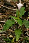 Erect, usually dichotomously branched annual or short-lived perennial herb, up to 1.5 m tall. Branches often purple-tinged and glandular, hairless or sparsely hairy when young; all parts unpleasantly scented. Leaves alternate, ovate, rhombic-ovate to elliptic, up to 20 × 15 cm, thinly textured, almost hairless to minutely pubescent, particularly near the base; base sometimes decurrent into the petiole; margin coarsely and irregularly toothed. Flowers solitary in the forks of the branches, erect. Calyx long and tube-like, up to 2.5-5 cm long, 5-angled with triangular-lanceolate unequal apical lobes, 4-10 mm long. Corolla white to pale mauve-purple, sometimes darker purple in the tube, 6-11 cm long, slightly 5-6-lobed with narrow acuminate tips. Fruit erect, almost round to ovoid-ellipsoid, up to 5 × 4.5 cm (including spines), densely covered with slender unequal spines, up to 16 mm long, yellow-green to brown when ripe, regularly dehiscent. All parts of the plant are poisonous. |