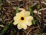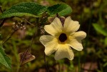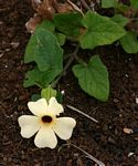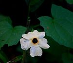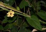 Trailing or twining annual or perennial herb with one to several stems, up to 3 m long, sparsely to densely white to yellow hairy, growing from a woody rootstock when perennial. Leaves opposite, triangular-ovate, 2.5-10.5 cm long,usually with hastate to rounded basal lobes, base running down into broad wings on the petiole; margin entire or coarsely toothed. Flowers axillary, solitary or in pairs. Corolla 5-lobed pale yellow to deep orange with a deep purple to almost black throat; lobes broadly emarginate; tube 3-6 mm long, straight or curved. |