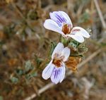 Erect or rarely decumbent, shrubby perennial herb, up to c. 1.2m tall. Stem 4-angled, aromatic when crushed, more or less densely covered with sticky glands and non-glandular hairs. Leaves opposite, elliptic to somewhat obovate, 3 - 20 cm long, hairless or with scattered glossy hairs on the veins; base decurrent; margin almost entire to toothed. Leaves often immature when flowering. Flowers in 1-3-flowered clusters in the upper axils, together often forming racemes or panicles with leaf-like bracts near the base of the inflorescence. Calyx with glandular and non-glandular hairs. Corolla white to mauve-purple with darker markings on the lower lip and a yellow to orange palate with stiff hairs on it. Fruit an obovoid capsule, 7-11 mm long, hairless or with scattered glands near the apex. |