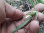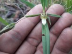 Erect, procumbent or scrambling annual herb. Stems up to 50 cm long, usually with a single band of silky hairs. Leaves linear-lanceolate to narrowly elliptic or ovate, 5-14 cm long, more or less roughly hairy, particularly on the midrib below; margin entire, rolled under. Flowers solitary, sessile or on short lateral branchlets up to 7 cm long with reduced leaves at the base. Bracts greenish to straw-coloured with purple bands and blotches, hairless, leathery and glossy, ovate to elliptic, acuminate; margin entire without spines or bristles. Corolla white to cream or pale blue or mauve, 4-29 mm long, often hidden among the bracts; lip oblong-elliptic, narrowing towards the apex, central lobe longest, ciliate or hairy. |