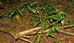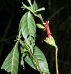 Shrub, 1-3 m tall, rarely a small tree. Bark pale brownish, with lenticels. Leaves opposite, narrowly elliptic, 14-25 cm long, velvety or sometimes hairy on the veins only, net-veining prominent below; margin entire. Flowers in axillary spikes, dull to bright red or maroon, 2-lipped, held in conspicuous green bracts with a reddish margin. Fruit beaked, 1.5-2 cm long, obovoid to oblong, woody, hairless to slightly velvety. |