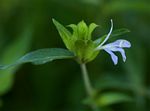 Shrubby perennial, sometimes scrambling, herb, up to c. 1 m tall. Leaves opposite, narrowly ovate or elliptic, 4.5 - 9.5 cm long, more or less sparsely velvety, particularly on the veins, base decurrent on the petiole; margin entire; petiole 5-13 mm long. Inflorescences in spikes, 1.5-6 cm long. Bracts green, sometimes purple-tinged towards the apex, ovate or elliptic with a sharp, recurved apical point, mostly hairless except for short glands and usually conspicuously ciliate on the margin and central vein. Corolla pale to bright blue; tube 10-13 mm long; lobes 4, 13-18 mm long; lower mid-lobe widest, up to 4 mm wide. Capsule 9-13 mm long, sparsely velvety on the sutures. |
