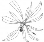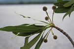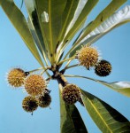 Medium to large evergreen tree. Leaves in whorls of 3 to 5 near the ends of branches, lanceolate to narrowly elliptic, leathery, dark green with the midrib yellow, raised conspicuously. Flowers in small axillary spherical heads of numerous minute, yellowish flowers. Fruits a small ball of capsules.