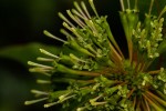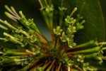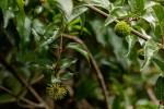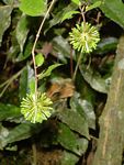 Usually a canopy climber or scrambling shrub, rarely a small tree, up to 5 m high. Leaves ovate to ovate-elliptic, hairless; domatia usually present. Inflorescence a loose globular terminal head, 2–2.5 cm wide including corollas; peduncle 2–2.5 cm long. Flowers with white or greenish tube, lobes maroon; calyx red or pink. Fruit heads becoming fleshy. |