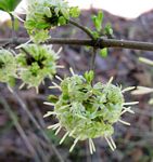 Deciduous shrub or small tree, up to 4 m tall, sometimes scrambling or climbing. Bark grey to brownish, often cracking and peeling; branchlets at opposite right angles or even bending backwards, occasionally spine-tipped near the base. Leaves opposite and often clustered at the ends of side branches, obovate to elliptic, up to 8.5 × 3.5 cm, softly velvety, particularly below; petiole 2-4 mm long; stipules hairy. Flowers in axillary and terminal heads, creamy-white. Fruit almost round, fleshy, c. 7 mm in diameter, crowned with the remains of the calyx, forming a conspicuous, whitish hairy ring. |