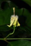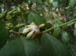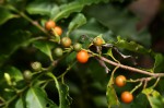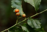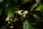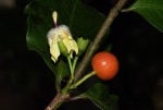 Large, somewhat scrambling shrub or small tree. Leaves opposite, elliptic to lanceolate, glossy green with indented veins and entire but wavy margins. Flowers in few-flowered clusters along the branches, creamy white with sharply reflexed corolla lobes, white hairs in the throat, and a bright red stigma. Fruit spherical, orange to brown-black when ripe. |