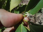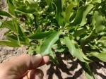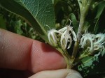 Small shrubby suffrutex, up to 40 cm tall, growing from a woody rhizome and often forming dense patches. Leaves opposite, obovate to elliptic 3-9 cm long, somewhat dimorphic with some smaller and broader, leathery, hairless on both surfaces except for the base of the raised midrib above; veins raised above, more than beneath; domatia absent; margin recurved, entire; petiole 1.5-3 mm long. Inflorescences 1-5-flowered, in somewhat supra-axillary sessile clusters. Corolla white; tube 4-5 mm long, hairless outside and dense hairs in the throat; lobes 5, 4.5-7 mm long. Fruit ellipsoid to subglobose, white turning purple to blackish, 6-8 mm in diameter, crowned by the spreading to upward curving calyx lobes. |