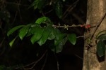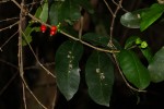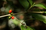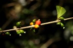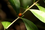 Shrub, rarely a small tree. Leaves opposite, obovate to elliptic, up to 11 × 4 cm, fairly thinly textured, glossy dark green, midrib hairy on both surfaces when young; hairtuft domatia distinct. Flowers in 3 flowered clusters without stalks, white or greenish-cream. Fruit round, 3-6 mm in diameter, crowned with the remains of the calyx, red when ripe. |