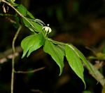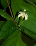 Shrub or small tree with branches and branchlets typically spreading horizontally. Leaves opposite, held in a horizontal plane; elliptic to narrowly ovate with a distinct drip-tip. Both surfaces thinly covered in short hairs. Flowers solitary, pubescent, corolla lobes with long green "tails", which are already visible when still in bud. The style is distinctly exserted. Fruits yellowish to pale green, spherical when fresh, turning 2-lobed when dry. |