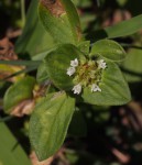 Prostrate, mat forming perennial herb or sometimes annual. Stems up to 40 cm long, densely covered in spreading hairs. Leaves elliptic, 1-6.5 cm long, usually covered with short hairs on the upper surface and on the margins and veins beneath; longer hairs near the base. Inflorescences terminal, 0.7-1.2 cm in diameter; bract ovate-elliptic, up 3.5 cm long with shorter bracts up to 1.7 cm. Corolla white, sometimes tinged pink with lobes 1-1.4 mm long. |