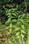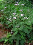 Erect shrubby perennial with annual stems 0.5-3 m tall. Stems mostly herbaceous, sometimes becoming woody below. Leaves opposite, sometimes 3-whorled, 4-20 cm long, elliptic to lanceolate, finely but roughly hairy on both surfaces; margin serrate-dentate. Inflorescence branched with many small capitula. Florets pale to deep mauve or purple. |