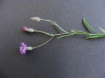 Erect, diffusely branched annual or short-lived perennial herb, up to c. 1 m tall. Leaves sessile, filiform to linear, up to 10 cm long, mostly shorter, gland-dotted on both surfaces and with fine rough short hairs above, often mucronate at the apex; margin more or less entire, sometimes rolled under. Capitula few to many in a lax corymbiform or paniculate arrangement; stalks up to 5 cm long, velvety. Involucre up to 7-10 mm long; bracts 4-5-seriate, lanceolate to ovate, 2-7 mm long, finely velvety. Corolla mauve to purple, rarely pink, up to 7.5 mm long, excserted beyond the involucre. Achenes 2-2-5 mm long, 5-6-angular or ribbed; outer pappus short, of oblong-lanceolate, more or less overlapping scales; inner pappus of brown-purplish or grey-brown barbellate setae up to c. 5 mm long. |