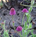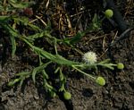 Small glandular annual herb, up to 25 cm. Stems prostrate to ascending, up to 60 cm long, covered in long hairs; wings absent or occurring for only a short distance below the leaves. Leaves variable, up to 6.5 cm long, cordate and clasping the stem at the base, densely hairy, particularly on the veins; margin entire or toothed, sometimes lobed. Inflorescences terminal or axillary, globose up to c. 10 mm in diameter on glandular hairy peduncles up to 6 cm long. Florets purple. |