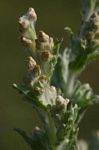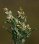 Annual herb, branching from the base, up to 25 cm tall but often flowering when only a few cm tall. All parts more or less densely covered in white cobweb-like wool. Leaves sessile or shortly petiolate, spathulate, 1-7 cm long, mucronate at the apex; margin entire. Inflorescence in a terminal spike with leaf-like bracts. Involucral bracts c. 3-seriate, oblong, c. 2 mm long, pale buff or purple-tinged. Florets small, numerous, whitish. |