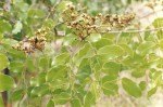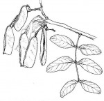 Flat-topped semi-evergreen tree. Bark pale grey when young, darker and rough when older. Leaves paripinnate with 3-4 pairs of leaflets; leaflets, oblong-elliptic, c. 9 × 5 cm, glossy green; apex rounded; margin entire. Flowers in branched heads, creamy-white, calyx and stalks covered in brown velvet. Fruit a pod, up to 11 cm long, velvety, dark brown. |