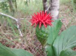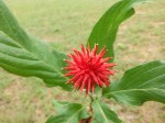 Erect suffrutex perennial with 1-several, mostly simple, annual stems, 20-180 cm tall, growing from a strong woody rootstock. Leaves alternate, lanceolate-elliptic, 6-24 cm long, discolorous, green and hairless above, whitish woolly beneath; midrib winged and somewhat sheathing the stems at the base. Capitula solitary, terminal, occasionally 2-4 on stout stalks or sometimes subsessile in upper leaf axils. Involucres 20-35 mm long with numerous leathery bracts; florets numerous, up to 25 mm long, bright to deep red. |