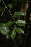 Shrub or small tree or a climbing shrub or liane, rarely with paired curled woody tendrils.Bark slightly rough, grey or blackish; branches sometimes yellowish, spotted but not with lenticels. Leaves more or less narrowly elliptic or ovate, 4-11 cm long, 2-3 x as long as wide, apex pointed into a drip tip, hairless and stiffly leathery; 1-2 pairs of secondary veins from near the base curving along the margin; tertiary veining reticulate, conspicuous and prominent in dry leaves which turn yellow; petiole 5-8 mm long, hairless. Inflorescences axillary and sometimes also terminal, congested and few-flowered, up to 2.5 cm long, much shorter than the leaves. Corolla white, hairless outside but densely hairy in the throat and inside of the lobes; lobes oblong, up to 3.5 mm long, recurved. Stamens exserted. Fruit ellipsoid up to 20 mm long, pale green with paler spot, eventually turning yellow or orange, often obliquely pedicellate, 1-2-seeded. |