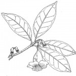 Small tree with a cracked reddish bark. Leaves opposite but sometimes appearing 3-whorled, oblanceolate, elliptic or obovate, 9-30 cm long, leathery, hairless above, sometimes slightly pubescent beneath; domatia usually present; petiole 3-15 mm long, more or less velvety.; stipules 3-angular, long acuminate, 4-5 mm long. Flowers in terminal, 3-17-flowered inflorescences, pendulous, sweetly scented. Corolla white with red-purple spots at the throat, golden velvety outside; tube 4.7-7.2 cm long, shortly cylindric and bell-shaped above widening up to 4.7 cm at the mouth; ovate, up to 3.5 cm long, whitish hairy inside. Fruit globose to ellipsoid, 2-4.6 cm long, rust-coloured, flaking, calyx limb persistent at the apex.