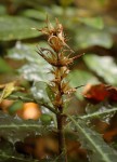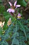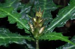 Perennial herb, up to c. 1 m tall, rarely taller, growing from a creeping rhizome. Leaves elliptic to obovate in outline, up to 30 cm long, varying from unlobed with remote, spiny teeth to deeply lobed with oblong to triangular spine-tipped lobes; surface rough with scattered stiff, bulbous-based hairs; petiole up to 2.5 cm long; stipule-like samll interpetiolar leaves absent. Inflorescences solitary, terminal, usually 3-15 cm long; bracts, green or purple-tipped, elliptic-obovate, more or less densely puperulous, 2.5-4.7 cm long; apical part, triangular, spine-tipped, with 4-12 large and small teeth each side. Flowers more or less pale pink to mauve. Capsule c. 2.5 cm long. |