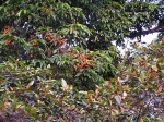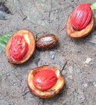 Dioecious evergreen tree to 22 m; sap copious, yellow, turning dark red on exposure to air. Young branchlets with reddish-brown stellate tomentum. Leaves 7-20 × 4-11 cm, dark green above, glaucous and densely glandular-punctate beneath, oblong to oblong-lanceolate or elliptic, cordate at the base; apex long-acuminate; glabrous or with scattered dark brown stellate hairs beneath; lateral nerves 15-20, prominent beneath. Petiole 7-14 mm, dark brown stellate-tomentose. Inflorescences usually borne on 2- or 3-year old branches below the leaves, 10-15 cm long, paniculate with densely rusty-tomentose branches. Flowers unisexual, scented. Male flowers: perianth 1 mm long, deeply 3-lobed. Female flowers: perianth lobes broadly ovate. Fruiting inflorescence pendulous. Fruits clustered, 3-4 × 2-3 cm, ellipsoid to oblong or pear-shaped, splitting vertically into 2 halves, yellowish-orange when ripe. Seed 1, dark brown, with a fleshy, laciniate, red or pink, aril. |