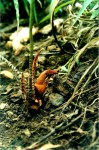 Rhizome vertical, 1-1.5 cm thick. Cataphylls 9-14 cm long, distinctly transversely barred with purplish barring and distinctly transversely ridged. Petiole 13-26(40) cm long., basal part marked and ridged as cataphylls. Blade narrowly triangular to ovate-elliptic in outline, deeply sagittate, basal lobes almost as long as anterior lobe. Inflorescence appearing before leaves, often paired, held at ground level. Spathe pale green to brown, erect, basal part inflated, obovoid. Infructescence underground. |