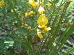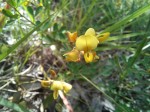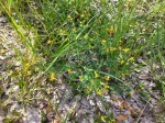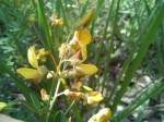 Subshrub, several-stemmed from a woody rootstock, (0.1)0.5–1.2 m tall, developing numerous shortish flowering branches above; branches ribbed, densely strigulose with frequently brown-based hairs, sometimes with slightly longer hairs interspersed. Leaves mostly 3-foliolate, uppermost sometimes 1-foliolate; leaflets 5–22 × 2–10 mm, oblong-oblanceolate to oblong-obovate or obovate, slightly coriaceous, densely strigulose or strigose-puberulent beneath; petiole 3–15(20) mm long, channelled; stipules 0. Primary racemes 2–5 cm long, ± laxly 6–10-flowered, with numerous shorter inflorescences developed on lateral branches and in the axils. Calyx 4–5 mm long, densely strigulose or strigose-puberulent; lobes acuminately or attenuately triangular, 0.8–2 times as long as the tube, often slightly involute, ± lanate inside (particularly the lower one). Standard elliptic-obovate to obovate, yellow, sometimes lined brown, glabrous or nearly so outside; wings as long as the keel or a little shorter; keel 8–11 mm long, angular, with a narrow twisted beak, slightly incurved at the tip. Pods subsessile, 6–8 × 4–6 mm, ovoid-globose, pointed, strigose-puberulent, 2-seeded. Seeds 2–2.5 mm long, rounded-cordiform, smooth, dark, with a small aril. |