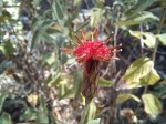 A lax perennial herb or subshrub 0.5-2.5 m tall from a woody rootstock. Stems 1-many, sericeous-lanate, simple and leafless in the lower two thirds, becoming woody; ± diffusely branched and leafy in the upper part with leaves clustered towards the ends of branches. Leaves discolorous and markedly bullate, briefly stem sheathing at the base, with the midribs often somewhat recurved; lamina 3-10 x 1-4 cm, ovate to oblong-ovate, acute at the apex and broadly cuneate below; margins sharply serrulate; upper surface bullate, silvery to greyish green thinly lanate-pubescent; lower surface densely greyish or brownish araneose-sericeous. Capitula numerous , usually terminal on branches with 2-7 subsidiary capitula in the axils below on short or long stout stalks. Involucres mostly 15-20 x 8-20 mm, spreading to c. 30 mm wide, cylindric-campanulate. Phyllaries usually purple, chartaceous, araneose-tomentellous outside, margins glabrous, broadly hyaline. Florets numerous, corollas bright or deep red, up to 18 mm long with a slender tube abruptly dilated into a short cylindric, deeply narrowly-lobed limb which exceeds the pappus and involucre, glabrous. Achenes 6-9 mm long, narrowly cylindric, obscurely many-ribbed, densely appressed hispid; pappus of copious barbellate setae to c. 14 mm long. |
