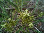 Subshrub 15–60 cm tall, with several erect or ± procumbent slender woody shoots from an underground rhizome; shoots at first scabrid yellowish-pubescent, later more or less glabrous and dark purplish-red. Leaves paired, not in whorls, 3–10 × 0.9–3.2 cm, elliptic, oblong, obovate-oblong or oblanceolate, rounded to subacute or obscurely acuminate at the apex, cuneate at the base, petiole c. 5 mm long; stipules 2 mm long, triangular, with appendages 2 mm long. Inflorescences borne at (1)3–6 nodes, 10–20-flowered, bristly pubescent; the inflorescence pair at each node forming a dense cluster up to 3.5 cm wide; peduncles and pedicels 3–5 mm long. Calyx tube 1.2 mm long, globose, densely pubescent; lobes 4–6.5 × 0.7–1 mm, linear, more sparsely pubescent. Corolla 5-tailed at apex in bud; tube 5.5 mm long, cylindrical to funnel-shaped, glabrous at base, densely bristly pubescent above; lobes 2–3 × 1.5–1.8 mm, triangular, with a terminal appendage 1.5–2 mm long. Pollen presenter shortly exserted, cylindrical, 10-grooved, 5-lobed at apex. Fruit yellow to orange, 1.2 cm in diameter, globose, said to be glossy, very sparsely pubescent; pyrenes small 6 × 5 × 3 mm. |