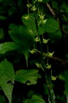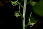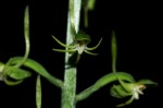 Terrestrial herb up to 80 cm high, growing from more or less globose tubers. Leaves along the stem, 8–12, basal 4 or 5 sheath-like, the lowermost foliage leaf about one third up the stem; upper leaves bract-like, middle ones spreading, oblanceolate or elliptic, 8–15 cm long, reticulate venation distinct; margin often undulate, clasping the stem at the base. Inflorescence 11–27 cm long, laxly 10–25-flowered; bracts lanceolate, c. 10 mm long. Flowers green. Ovary and pedicel c. 15 mm long, arched. Dorsal sepal ovate, erect, 4–6 mm long; lateral sepals elliptic, 6–7 mm long, deflexed. Petals 2-lobed more or less to the base; upper lobe linear, 5–6 mm long, erect, adnate to dorsal sepal; lower lobes 6–7 mm long, spreading and curving up. Lip 3-lobed more or less to the base; mid-lobe 5–8 mm long, deflexed; side lobes 4–7 mm long, parallel to lower petal lobes; spur 15–20 mm long with a hairy tooth in the mouth; slightly swollen in apical half, curved up and projecting above the flower. |