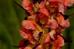 Terrestrial herb with separate sterile and fertile shoots. Sterile shoots up to 15 cm tall, with 2–3 narrowly elliptic, erect, conduplicate leaves, up to 20 cm long. Fertile shoots 40–70 cm tall; basal leaves 1–3, small, completely sheathing; the remainder more or less narrowly ovate, 4–8 cm long. Inflorescence 10–30 cm long, densely, up to c. 150-flowered. Bracts lanceolate, 1.5–2.5 cm long, reflexed at the apex, dry. Flowers orange-red with darker mottling, c. 1 cm in diameter. Dorsal sepal hooded, obovate, 9–10 mm long and 3–4 mm wide, obtuse, facing more or less downwards. Spur pendent, club-shaped, 7.5–10 mm long. Lateral sepals narrowly ovate, 8–10 mm long, spreading or reflexed. Petals 2-lobed; posterior lobe erect, 7–8.5 mm long; anterior lobe originating about halfway up the posterior lobe, equalling the posterior lobe in length, the front margin crenulate or undulate, curved in front of the anther. Lip more or less pendent, strap-shaped, 7–10 mm long. |