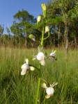 Terrestrial herb 60-100 cm tall growing from subterranean elongated rhizome; leaves 2-6, 27-52 cm x 4-14 mm, linear, absent or just starting to at flowering time; inflorescence laxlyto densely several to many flowered; scape with 3-4 sheaths spread along its length; flowers white, sepals green towards apex, lip sometimes flushed with lilac at base; ovary and pedicel 10-20 mm long; bracts 6-10 mm long, lanceolate; sepals all similar, erect, spathulate, 10-13 x 4.5-9.5 mm; petals 9-13 x 8-11 mm, elliptic to circular, lying over column; lip 13-21.5 x 8-12 mm, obscurely 3-lobed; mid-lobe 9.5-12.5 mm long with callus of 5 low keels in the centre, margins undulate (wavy), side lobes narrowly oblong; spur 2-6.5 mm long, conical with blunt apex, recurved.
