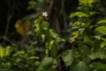 Scrambling shrub with stiff, straight branches climbing up to 8 m high. Leaves simple, often more or less 3-whorled, narrowly ovate-elliptic, 2.3-6.5 cm long, thinly leathery, hairless, glossy bright green above; petiole 8-10 mm long. Inforescences terminal and axillary, densely corymbose, hairless. Calyx with a tube 2-3 mm long and 5-6 very short triangular teeth, hairless. Corolla white inside, pinkish-brown ourtside; tube 14-23 mm long; lobes 6-9, elliptic, 7-10 mm long. fruit 1-2-lobed with lobes elliptic, c. 1 cm long when dry. |