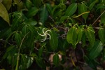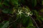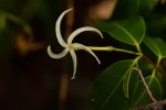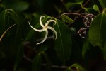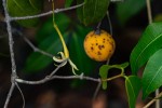 Scrambling shrub or climber up to 3 m high. Tendrils commonly present. Young shoots hairless or hispidulous. Leaves ovate, oblong or narrowly elliptic, 4·5-6·8 cm long, tapering at apex to a long distinct acumen, base rounded to acute, membranous or thinly leathery, not strongly discolorous, glossy and hairless on the upper surface, midrib raised or level, secondary and tertiary veins faintly raised or impressed to give a finely “cracked” appearance; lower surface completely hairless or with the midrib hispidulous, a similar indumentum often found also near the base of the lamina, midrib raised, lateral and tertiary veins raised or impressed; petiole 2-5 mm long, hairless or hispidulous. Flowers white, scented, in lax terminal 1 to 4-flowered cymes with axes hairless or hispidulous. Calyx 2-3 mm long, lobes united at base, ovate-acuminate, ciliate, dorsally glabrous or puberulent. Corolla tube 15-18 mm long, slender, swollen near apex at level of stamens, hairless, not constricted at the mouth; corolla lobes more or less equalling tube, narrowly linear, hairless. Fruit globose, c. 2 cm in diameter, yellow or orange with spots when ripe, edible. |